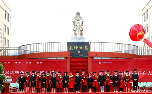 仪式开始,全体人员向中国古代思想家、教育家“至圣先师”孔子行三鞠躬礼。2021届本科毕业生学位授予仪式在优雅欢快的音乐声中拉开序幕。在主持人的引导下,2021届本科毕业生以学院为单位,在学院院长的带领下,依次上台,向老师们行长揖礼,感谢老师们持之以恒的教导。出席仪式的校长、副校长为每位毕业生颁发学士学位证书,扶正流苏,并合影留念。