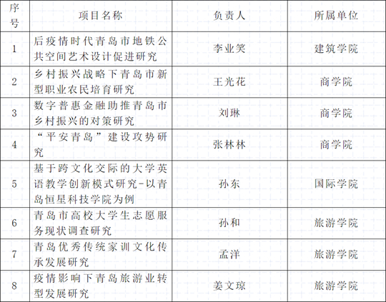 近日,青岛市社科规划办公示了2021年青岛市社科规划项目拟立项名单,青岛恒星科技学院喜获拟立项8项。