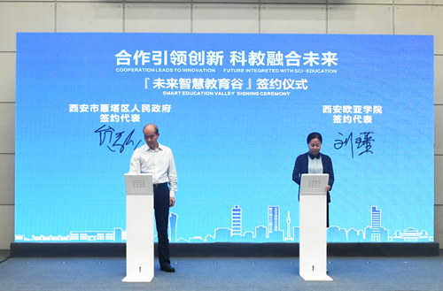 打造智慧教育产业经济圈,创建产学研深度融合示范区,9月23日上午,西安市雁塔区人民政府与西安欧亚学院联合共建的“未来智慧教育谷”签约揭牌仪式在西安欧亚学院举行。