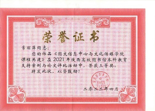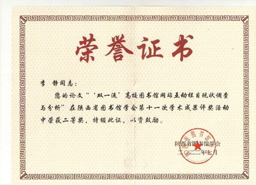 近期,陕西省图书馆学会举行了第十一次学术成果评选活动,西安欧亚学院图文信息中心李静老师的学术论文《“双一流”高校图书馆网站互动栏目现状调查与分析》荣获陕西省图书馆学会第十一次学术成果二等奖,该论文也被收录于中文社会科学引文索引(CSSCI)。