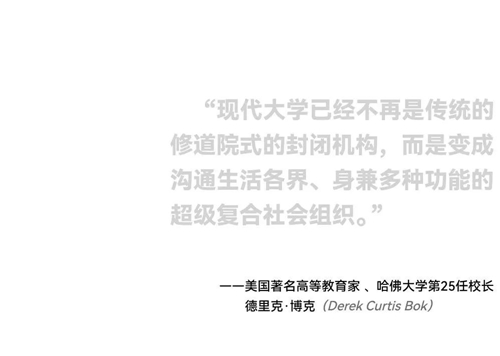 面对社会的急速发展与巨变,博克认为,相较于传统大学,现代大学不仅要维持传统,更要走出“象牙塔”,在保持自我理性与学术价值的基础上,融入社会、服务社会并引领社会。