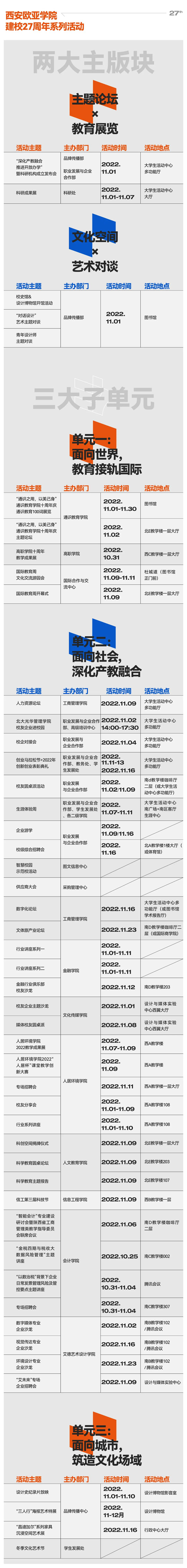此次建校27周年系列活动,基于学校“面向世界开放”、“面向社会开放”和“面向城市开放”三大主线,以【2大主版块】+【3大子单元】的活动结构,与众多院系、职能部门一道,为大家带来包括文化、学术、展览、艺术、交流、论坛、圆桌派等在内丰富多彩的活动,与开放的欧亚一起,感受教育精彩!
