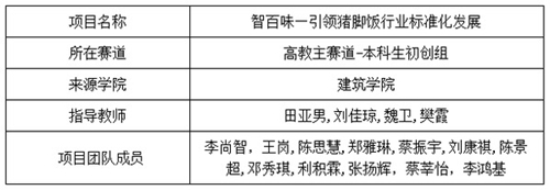 “智百味—引领猪脚饭行业标准化发展”项目团队是由广州城市理工学院建筑学院等多个学院跨学科专业的毕业生与在校生组成,核心成员有着丰富的餐饮品牌营运经验。该项目中的徐大川剁椒猪脚饭至今已开出了800余家加盟店,年营业额达6亿元,累计带动就业超过5万人,先后荣获餐饮行业“最具投资价值奖”、“最具影响力品牌奖”、“饿了么新锐品牌奖”“全国万单店排行榜TOP120”“中国外卖领航品牌金钻奖”等数十项荣誉。广州城市理工学院对项目进行了历时7个多月的打磨、指导,在经过校赛、省赛的激烈角逐后,最终“智百味—引领猪脚饭行业标准化发展”项目获得全国总决赛资格。在网络评审、复赛会评、金奖争夺赛等环节,该项目团队一路坚持、一路收获。决赛现场,项目负责人从产品研发、市场定位、品牌介绍、商业模式等方面对项目进行介绍,整个比赛过程自信大方、淡定从容,提问环节紧抓重点、对答如流,最终荣获高教主赛道本科生初创组银奖。