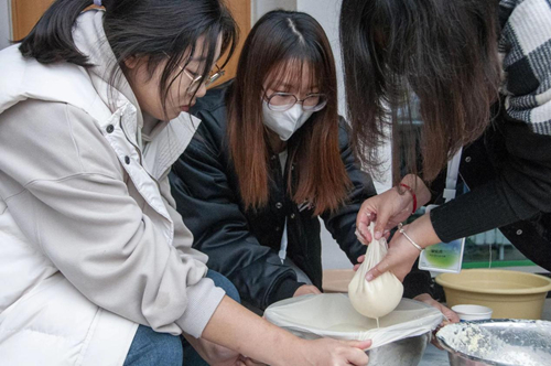 首先映入眼帘的是忙碌的同学正体验手磨豆浆,先用豆子加上水放在石磨里磨,磨出一桶一桶的生豆浆,在把生豆浆放在锅里煮,然后放入盐卤凝成快,在压榨出一部分的水分,这样就做出了令人谗涎欲滴、鲜美可口的豆腐了。虽然做起来很繁琐,但是看到纯白香浓的豆浆流出,一块块豆腐成型,在场的同学无不欢欣鼓舞。