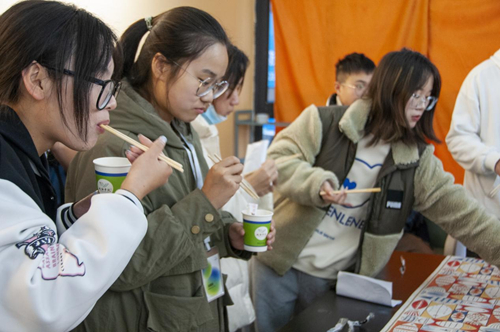 空气中弥漫着阵阵的香气,随着人潮移动的方向,在中式烹调师杜雨航同学的忙碌下,映入眼帘的是各色各样诱人的豆腐美食,麻婆豆腐,葱焖豆腐,麻汁炸豆腐,鸡汁豆腐虾仁……一把嫩绿的葱花,加上鲜红的辣椒沫,圆滑细润的豆腐轻而易举地勾起了在场同学们的食欲。一口下去,嫩滑的豆腐在嘴里化开,温暖的感觉顺着喉咙一直到胃里,这简直就是味蕾的饕餮盛宴。