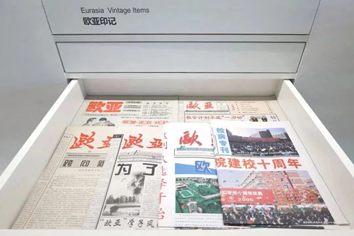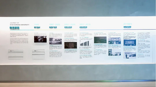 在展陈方式上,校史馆既珍藏了欧亚在变迁过程中标志性实物,又置入了多部多媒体设备,更设置了不同主题的展台,以互动、开放、共享的陈列方式,释放无限生长、创新改革的欧亚面貌,引发观者对于教育的更多思考和感悟。