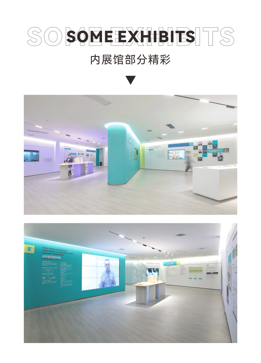 在空间表达上,校史馆色调简洁明亮,大片纯白的墙面穿插欧亚绿与VI辅助色,强化品牌认知。在建设上,通过现代化的建筑理念、视觉设计与材料技法,一改传统校史馆建设面貌,使空间以一种年轻、友好的姿态,吸引观者舒适地穿越其中,驻足、浏览、思考。