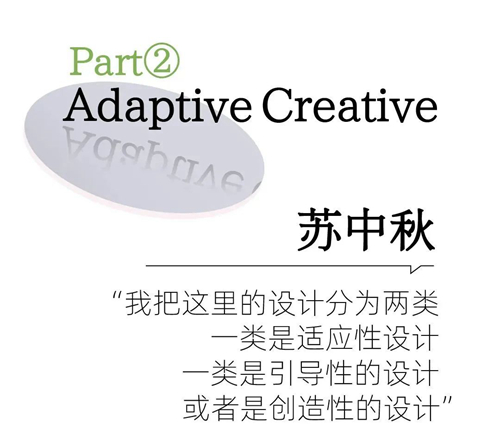 依据设计跟社会的关系、跟民众的关系,我把设计分成两类,一种是适应性设计。这个适应性设计就是让我们的生活更便利,或者某个东西更好看,或者某个东西更畅销。这种设计是基础的、基本的,需要设计师有一个良好的生活经验,他必须自己要充分使用这个环境中任何经过设计的东西,比如说他开过车、住过某种环境,穿某个衣服、用过哪些家具,他有经验,有一个敏锐的感受,然后他有感受力,觉得那个东西再这样会更好,或者再那样会更适当一点、或者更省钱一点、或者更顺手一点等等;其次,他还有一个非常灵活的大脑,他可以思考这些问题,有一些人认为自己生活的东西可以了,不需要再改进了,他很敏锐、并且很善于思考;第三,他有专业能力,他有这个能力可以改造之后,把他的想法实现了,这是一个层面的。