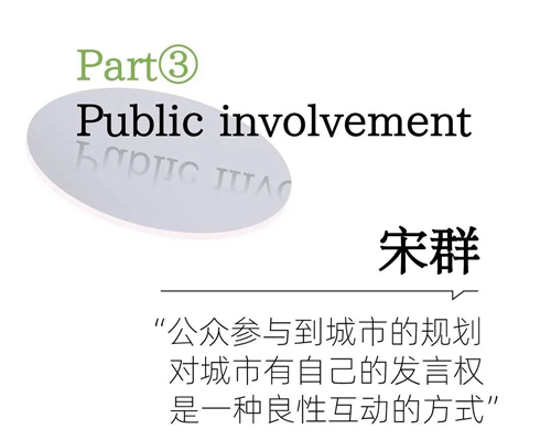 一个城市应该有的生活,它不是办公、生活、商业完全是割裂开的,规划也好、设计也好,完全割裂开的方式不适应人的需求,人的需求也在发生变化,一个好的城市需要每个人参与自己的意见和想法,不管这个机会多么渺小,几乎是不存在,但是你应该观察、研究、讲出来,这是挺重要的,专业的人也会听到。