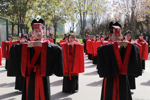 人文与国际教育学院的同学们身着华丽的汉服,向圣人膜拜,向经典致敬。齐声诵读《论语十则》表达对先贤至圣的敬仰之情,仪式在朗朗诵读声中缓缓落下帷幕。