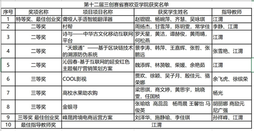 西安欧亚学院赵锟锟、杨婉萍、齐慧、吴咏琪四位同学参赛的 “聋哑人手语智能翻译器”项目力压群雄获得省赛总决赛第一名,该团队获得特等奖和最佳创业奖,指导教师江渭获得最佳指导教师奖,创学校历届参赛最好成绩。其他获奖作品围绕养老、垃圾分类、水果助农、电商运营等社会民生与经济热点展开,部分项目已经获得了良好的社会效益。