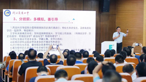 湖北襄阳四中副校长刘明国介绍了“新高考”背景下学校的探索和实践。他指出,首先要认真学习文件,积极应对。学习新高考国家相关政策,做好新高考的思想、政策、师资、硬件与技术准备;其次要做好指导,分好班级。从入学前、入学后、分班前三阶段来进行;再次,统筹规划,做好教学工作;最后,质量是本,坚持特色发展,丰富多彩的探索性实践提供了非常有价值的参考和借鉴。