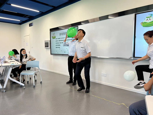 “球不落地,永不放弃”说的就是我们的小游戏-“气球飞舞”,大家头脚并用,一路前进,从起点到终点,大家用自己的方法将气球顺利转运。