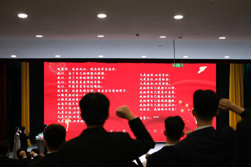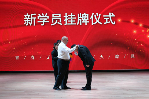 接着,便是学员们期待已久的授牌仪式,耿献文亲自给全体双体学员进行授牌。小小的胸牌,是双体职场化的体现,也是双体作为荣誉学院身份的象征。学员们在激情昂扬的音乐声中,登台,鞠躬,低头,接牌。这些动作一气呵成,并不需要太多的技巧,每一位同学却在尽力将每一步做得标准得体,带着校长亲切的祝福,双体学员犹如一个个授勋的勇士,昂首阔步,步伐坚定又自信。无需他言,这就是对双体精神最好的诠释。
