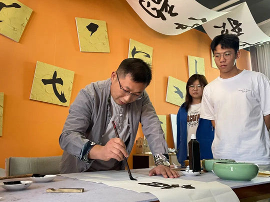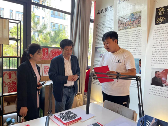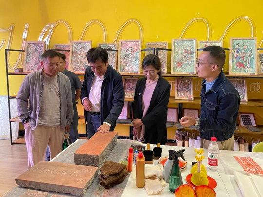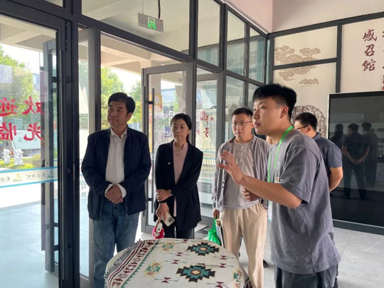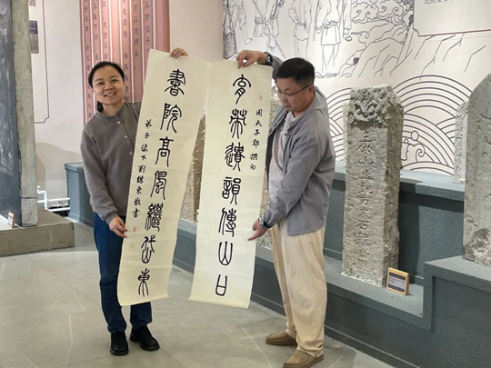 周郢教授一行在东岳书院,重点参观了非遗中心的手作泰科工坊、一纸空间、剪纸面塑工坊,以及泰山石敢当民俗展厅。东岳书院综合办公室主任范锦峰详细介绍了书院的运行机制、活动开展的情况等。在一纸空间工坊,书法家刘继东先生题字“育英新韵”赠予空间,对书院发展模式表示认可,期望书院继续培育英才,传播文化。非遗中心教师赵国靖介绍了拓片、水陆画、泰山剪纸、泰山木版年画等非遗传习项目和泰山石敢当民俗展厅。周郢教授在参观泰山石敢当民俗展厅时表示,做文化研究不仅要有理论支撑,更要有情怀,将自身研究与文化发展相融合,研究成果才能让更多的人感受到传统文化的魅力。