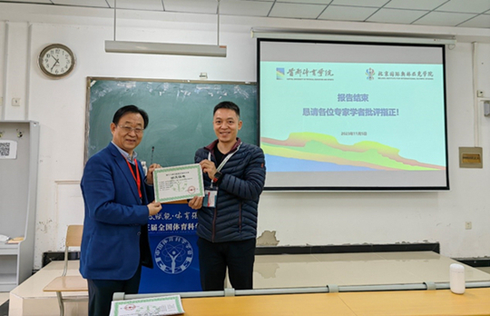 11月4日下午,马伯韬进行了《在民间信仰视阀下对传统武术的探赜方向》专题报告,他运用田野调查法从传统武术的民俗活动、礼仪文化、技术发展等方面进行论证,寻找传统武术在民间信仰下的传承发展。11月5日上午,马伯韬以《探幽长兵运动在高校武术课程的新思路》为题作报告,结合真实教学案例,阐述教学新理念,交流新的教学方法和内容,期间与专题汇报专场的主持人和各位参会代表进行了深入的学术交流并受到热烈好评。梁荣发以《基于竞赛驱动的飞镖课程思政教学模式探索》为题进行专题报告,从实践操作层面对教学中融入工匠精神、礼仪教育等思政元素进行探讨,为实现“以赛育人”提供学理支持及具体教学设计方法,以期为广大体育工作者提供实践启示,受到与会专家的广泛认同。