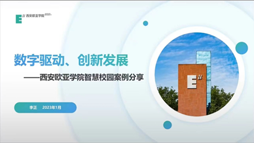 2023年1月11日下午,由中国民办教育协会主办,中国民办教育协会高等教育专业委员会承办的“构建数字化平台助推民办高等教育高质量发展论坛暨2022民办高等教育年会”顺利召开。本次论坛旨在加强民办高校数字化建设和应用经验交流,通过数字技术推动中国民办高等教育高质量发展。西安欧亚学院副校长李正出席本次会议,并做了题为《数字驱动、创新发展—西安欧亚学院智慧校园案例分享》的专题报告。