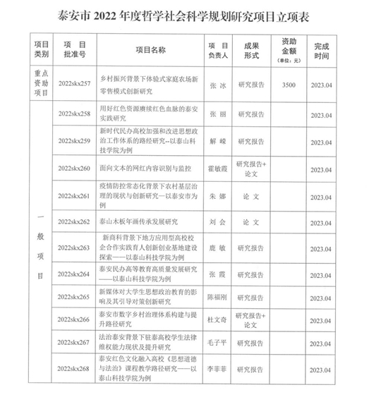 | 泰山科技学院12项课题获得泰安市2022年度哲学社会科学规划研究项目立项 |