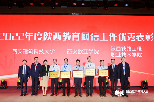 数字教育大会现场进行了2022年度陕西教育网信工作先进表彰,西安欧亚学院图文信息中心再次荣获全省教育网络安全和信息化工作先进集体,这已是西安欧亚学院连续第五年获评该项荣誉称号,图文信息中心主任罗征登台领奖。
