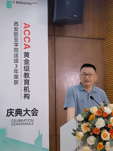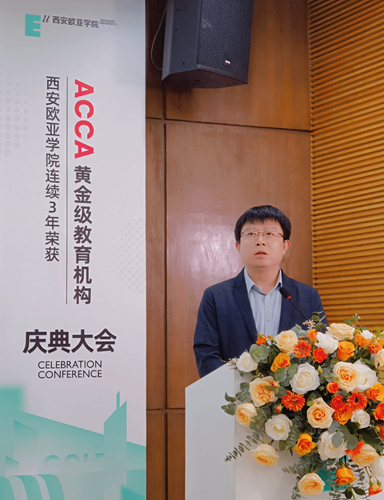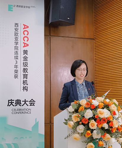 西安欧亚学院招办王丽霞主任在庆典大会上说:欧亚学院连续3年荣获“ACCA黄金级教育机构”的成就离不开谢涛院长、吴晓光教授带领的卓越的管理团队、教学团队、机考团队。欧亚ACCA全球双机考点,保持全国多项第一、唯一办学荣誉,未来学校招生办会结合ACCA中心2023年招生选拔条件、标准和招生目标,将会进一步提升ACCA项目生源的质量,在ACCA BEIJING OFFICE的帮助下,提高ACCA项目参考率和通过率,共同携手打造高ACCA质量教育教学水平。