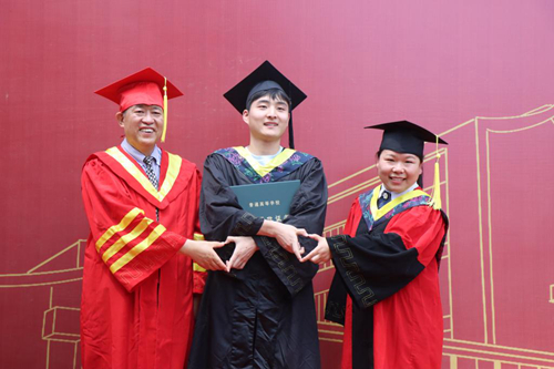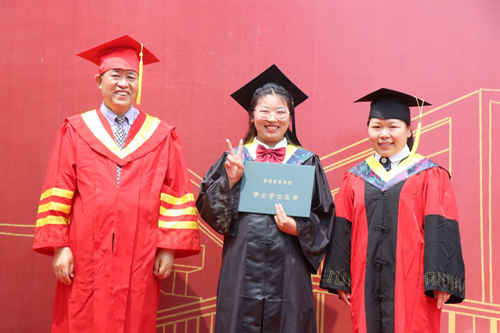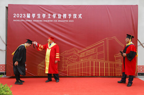 在学士学位授予仪式现场,各位校领导与毕业生亲切握手,并送去祝福话语,希望毕业们在新的征程中开启自己人生的下一个奋斗目标,为人生做好更充分的规划。毕业生鞠躬感谢学校的培养,校领导为毕业生扶苏正冠、颁发学位证书,并现场合影留念。虽然临近毕业,但是毕业生们的热情和活力不减,在学士学位授予仪式现场,毕业生们和自己的小伙伴们一起在背景板前合照,记录下自己人生的重要时刻。值得一提的是,在五汶书院耿献文教授授予毕业生学士学位现场,来自通信工程学院毕业生的一对双胞胎萌娃“乘车”驾到,着实让同学们惊喜不已。耿献文和萌娃亲切合影,并以长者的身份向孩子送去一份红包,现场祝福声、欢笑声不断。