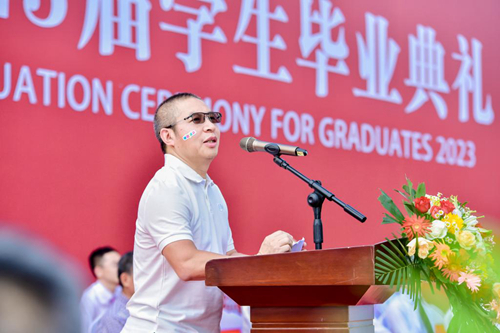 彭鸿斌博士为毕业生们带去远行前的叮咛与嘱咐。彭鸿斌说,人生是一场未知的旅程,它的魅力正在于一切行迹、风景都无法事先准确规划。此前的沿途,多少都是父母相伴或者导游;从今以后,需要自己拥抱这个自由和责任,勇敢单飞,活出自我的精彩。彭鸿斌现场讲述了行政管理学院牛秀芝、赵文慧,智能工程学院董红勋,通信工程学院尹树喆,大数据学院高健及部分学生家长与学校间发生的故事。虽然泰科新校区建校时间较短,但是学生们来到泰科后,能够尽己所能去追求自己所热爱的东西,友好地为所欲为,让学生可以重新找到自我,快乐、自信。学校有现在的教育成效,是因为撷取古今教育菜谱,响应了时代召唤,在教育实践中逐渐凝练出“四位一体双院制”高质量人才培养体系,为国家培养数字经济时代高情商经营管理人才。彭鸿斌期望每一名毕业生们都能够成为社会精英,在企业就业、自我创业、提升学历的征程中,不要自卑,但要谦卑;绝不躺平,永远折腾,从最简单的工作开始,长期坚持不懈,不管生活如何一地鸡毛,永远纯真如初、仰望星空,真正为公司、社会、国家做出自己的贡献。彭鸿斌最后向毕业生们承诺:“二十年后,如果后悔上了泰科,请来学校要求退学费;二十年后,如果庆幸上了泰科,请常回来看看!”