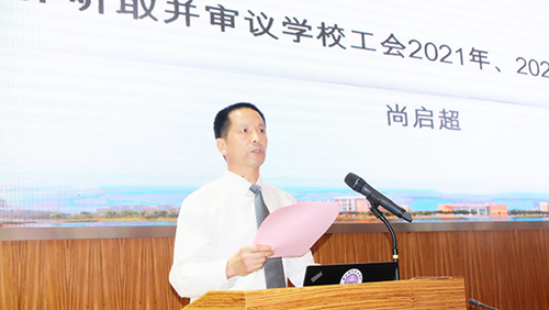 会议在庄严雄壮的国歌中拉开帷幕。副校长尚启超作了《学校工会2021年、2022年工作报告》。他指出,在学校党委的正确领导下,校工会围绕学校中心工作,在校园疫情防控中克服困难、履职尽责,围绕庆祝建党100周年等系列活动,认真学习贯彻党的十九届六中全会、党的二十大精神等,团结带领各级工会组织和工会干部,积极开展工作,关注民情、暖心服务,为校园稳定、学校发展贡献了应有的力量。他展望道,学校工会将继续坚持党的领导,进一步增强对“两个确立”、“两个维护”的政治认同、思想认同、理论认同、情感认同,持续推进主题教育走深走实,在以学铸魂、以学增智、以学正风、以学促干上取得更大成效,在学校党委的领导下,在全体教职工的支持下,继续探索和改进学校工会工作方式方法,守正创新,充分发挥桥梁纽带作用,不断推进工会工作高质量发展。