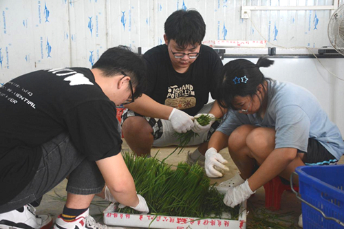 实践团成员分拣韭菜(邓玉坚摄)