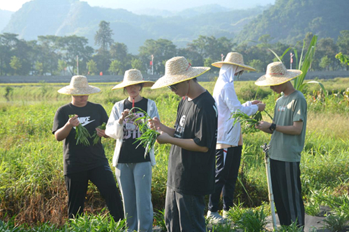 实践团成员采摘并分拣空心菜(邓玉坚摄)