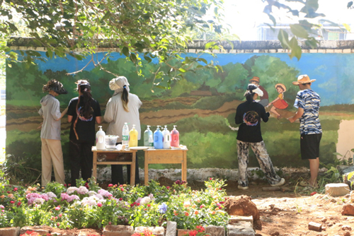 “以农耕文化为主题绘画,不仅呼应步月村舒适宜居的田园风光,而且寄托了实践团对步月村美好生活的祝愿。”实践团成员张慧盈说:“我们巧妙运用青砖灰瓦、旧瓦罐等传统的乡土元素符号参与造境,让‘四小园’景观更能彰显乡土本色,传递浓浓‘乡愁’。”