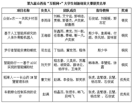 近日,山西省教育厅发布了《关于公布第九届山西省“互联网+”大学生创新创业大赛获奖名单的通知》(晋教高函〔2023〕37号),晋中信息学院在本届大赛中荣获省级奖项6项,其中《众创e农——共筑乡村百年》项目获得省级银奖,《基于人工智能所研究的人体外骨骼机器人》、《梦行者智能安康助眠枕》、《智能助行——基于AIGC实现的智能辅助杖》项目获得省级铜奖,《稻草人——长山药3M智慧管理系统》、《车载粮仓控制系统的设计》获得省级优秀奖。