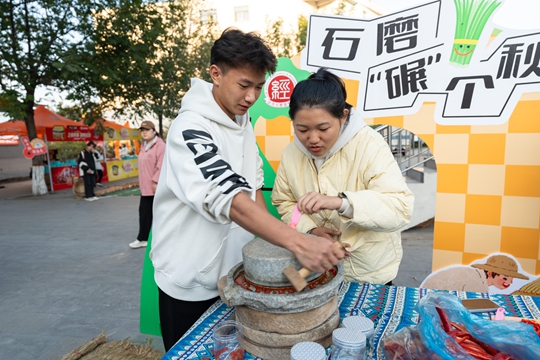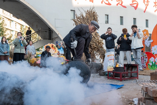 巧手剥玉米、石磨碾辣椒、土窑烤红薯、古法爆米花、古匠打糍粑......师生们围坐土窑前,在炭火升起的缕缕青烟里,与6位老艺人一同体悟“田园”。来自太谷区的王饮花奶奶介绍到“我们小时候叫‘打爆米’,这种老式技艺能够走进校园里,带孩子们找回我们那个年代的记忆,很难得。这个学校对传统技艺、耕种劳作都很重视,让孩子们忆苦思甜,珍惜大学生活。”