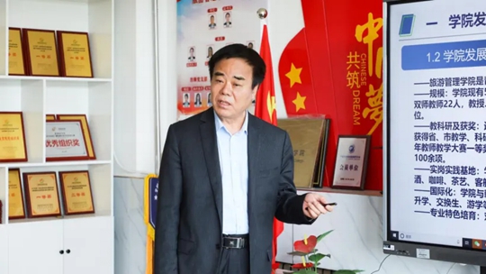 王伟院长详细介绍了青岛恒星科技学院旅游管理学院的发展历程、专业设置以及近年来在产学研合作方面所取得的成果。王伟院长提到,学院始终贯彻“产教融合、资源共享”理念,目前共建成18个校外实岗实践基地,包含青岛洲际酒店集团、海名会展集团等知名集团,以及10个校内实验室及实践基地,可以充分满足学校师生实践教学需要。