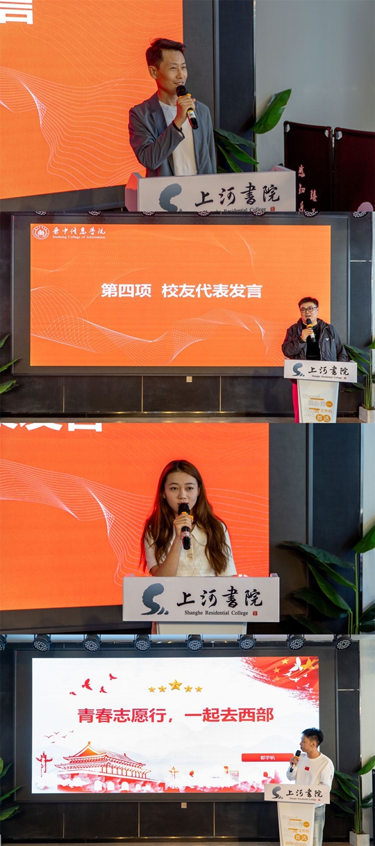 一系列仪式的进行,不仅是对校友们过往成就的认可,更是对校友们未来为母校发展贡献新动力的深切期待。山西巨巢财税集团有限公司总经理2010级校友任雅斌深情地表示:“在毕业后的岁月里,我深切感受到了母校对校友们的关怀与温暖。学校的帮助与支持是我取得今日成就不可或缺的力量。回顾初入校园时,学校仅有六栋楼,而如今已发展成为如此规模,我深感自豪与感激。”安晓波校友也感慨道:“在信院的求学经历是我人生中最宝贵的财富。学校在我成长道路上给予的无私帮助与支持,让我在创业路上更加坚定与自信。我希望能够成为母校学子未来就业的一个平台,实现校企双赢。”此外,北京交个朋友公司运营负责人2018级校友何水花、新疆生产建设兵团五家渠市奇台农场团委副书记2018级校友都宇帆等校友也分享了各自的发展经历与感受,展现了校友们在不同领域的卓越成就与风采。