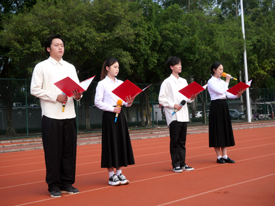 今年是新中国成立76周年,也是中国人民抗日战争暨世界反法西斯战争胜利80周年,学生艺术团司仪队激昂地朗诵《民族丰碑》“我仰起头,向着远去的战争凝望……”,引领广大师生共同铭记历史、缅怀先烈、珍爱和平、开创未来。