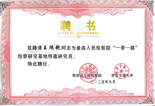 西安培华学院法学院院长王鸿貌教授受聘最高人民检察院“一带一路”检察研究基地特邀研究员 |