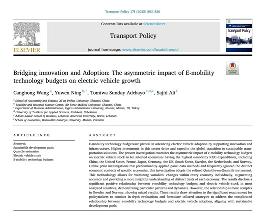 近日,西安培华学院会计与金融学院王仓红博士作为第一作者、学院为第一署名单位的研究成果《Bridging innovation and Adoption: The asymmetric impact of E-mobility technology budgets on electric vehicle growth》在SSCI收录的国际学术期刊《Transport Policy》正式发表。该期刊位列JCR分区一区、中国科学院分区一区Top期刊,2025年影响因子5.3分。