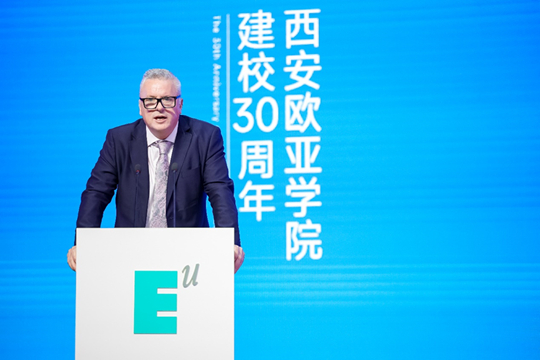 2026年,伯明翰大学学院将与西安欧亚学院将正式启动计算机科学双学位项目,让学生同时获得两校学位,融合英国学术卓越与中国数字创新活力。这将培养具备全球视野、创新思维和跨文化合作能力的新一代毕业生。感谢胡董事长及团队促成此合作,这不仅关乎学位,更是思想的发现、东西方在课堂相遇激发的无限可能。祝欧亚三十岁生日快乐!愿未来三十年你们继续照亮这个被你们点亮的‘平凡世界’。”