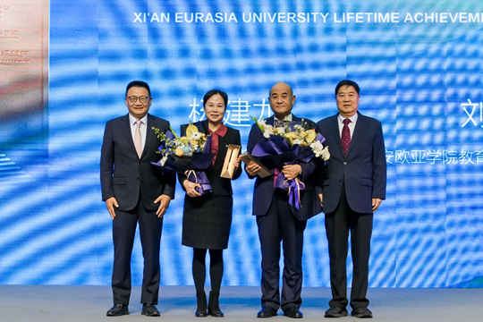 “欧亚教育终身成就奖”旨在表彰在学校发展中作出重大历史贡献、产生重要影响的专家、学者和卓越管理者。本奖项由董事长提名,在建校三十周年之际,特别授予西安欧亚学院副董事长杨建龙,西安欧亚学院教育发展基金会理事长、原校长刘瑾,以崇高敬意致敬他们与欧亚风雨同路的无私奉献与坚定坚持。
