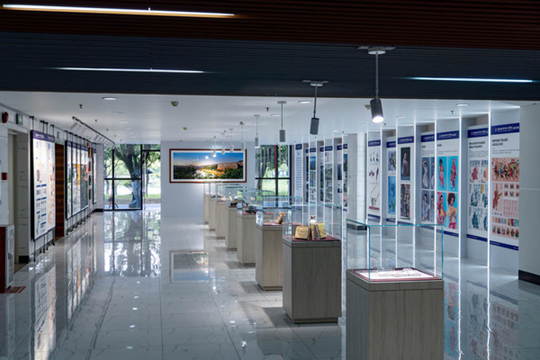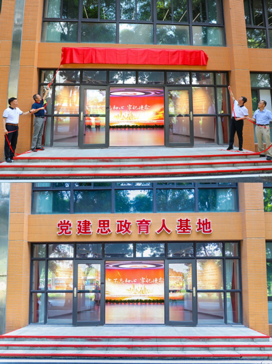 党建思政育人基地位于行政楼一、二层,占地1330.56平方米,是立体化呈现党史校史融合育人的重要平台,形成“可听可触可感”的思政教育新范式。一楼展馆由“璀璨的中华文明”“光辉的奋斗历程”“广东红色印记”“习近平新时代中国特色社会主义思想”“习近平总书记关于教育的重要论述(摘编)”“中国共产党人精神谱系”“加强党对学校工作的全面领导”“落实立德树人根本任务”等8个板块组成,前6个部分系统构建了从历史纵深到时代担当、从思想引领到实践方略的完整逻辑链条,展陈内容展现了中华文明的赓续与党的奋斗光辉,阐释了习近平新时代中国特色社会主义思想的实践伟力;后2个部分展现了学校在落实党的全面领导,确保党的教育事业始终沿着正确方向前进的生动实践。二楼展馆由“创始人”“历任领导”“传承沿革”“领导关怀”“党建引领”“人才培养”“师资队伍”“国际交流”等14个板块组成,以沉浸式展陈方式,全景呈现了学校二十载办学历程、办学成果与育人成效,通过丰富的图文资料和实物展品,直观感受学校在人才培养、科研创新、社会服务等方面取得的丰硕成果。