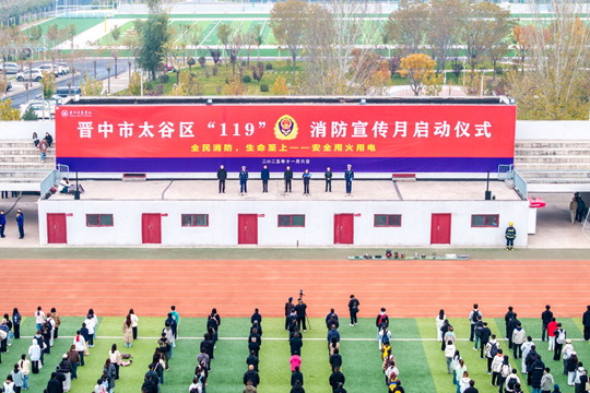 11月6日上午9时,晋中市太谷区“119”消防安全宣传月启动仪式在晋中信息学院运动场举行。太谷区委常委、常务副区长程锡威、太谷区应急管理局局长史建忠、太谷区消防救援大队大队长张玉龙、教导员范超、晋中信息学院党委书记张存伟、副校长傅永林出席启动仪式。太谷区消专委成员单位代表及消防安全重点单位负责人、晋中信息学院师生共计700余人参加活动。