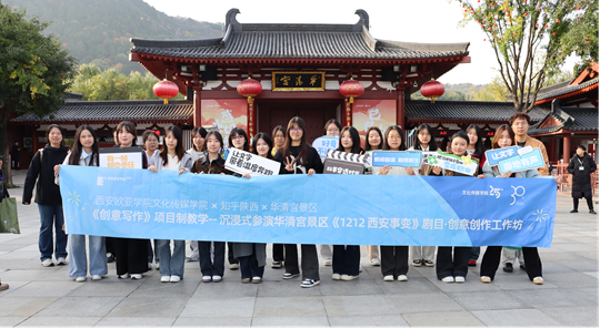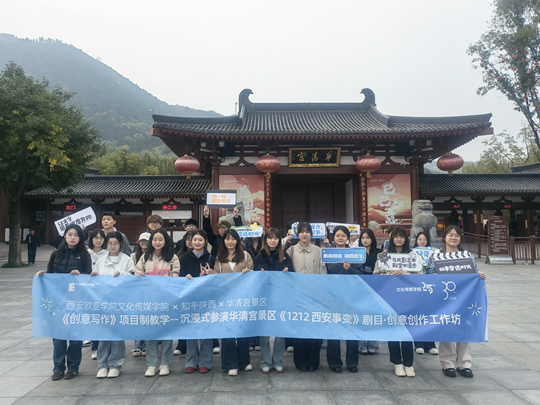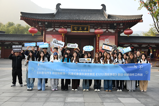 10月30日至11月1日,西安欧亚学院文化传媒学院新闻学专业联合知乎陕西运营中心、华清宫景区,组织新闻学2024级学生走进华清宫景区,开展了一场别开生面的《创意写作》课程实践教学活动。本次活动以国家级文旅IP——《1212西安事变》沉浸式影画剧目为载体,通过“沉浸式参演+创意内容转化”的项目制教学、工作坊教学模式,让学生从“旁观者”变身“参与者”,在历史现场激活五感,在创意实践中重构叙事,实现“历史活化”与“Z世代叙事创新”的双向奔赴。