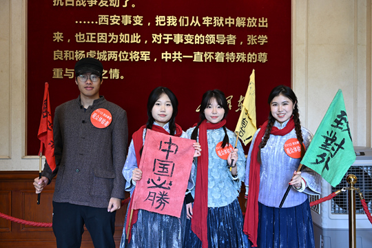 华清宫的亭台楼阁间,百年前的历史风云仿佛触手可及。学生们身着民国风格服饰,手持旗帜,走进《1212西安事变》演出的瑶光阁剧场。随着大幕拉开,先进的舞台技术与演员的精彩演绎,将1936年冬日那个惊心动魄的夜晚——张学良、杨虎城两位将军发动“兵谏”、“逼蒋抗日”的历史瞬间,立体地呈现在众人眼前。