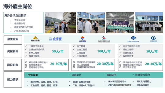 2.搭建国际化人力资源服务平台:该校联合深耕东南亚市场8年的北京山海图科技有限公司,对接中铁、中建、中交等20余家基建龙头企业海外岗位需求,已为西安欧亚学院人居环境学院2025届毕业生成功匹配海外管理岗、技术岗45个,搭建了学校连接国际优质岗位的桥梁。