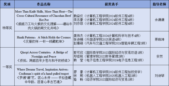 作为首次组织参与该赛事的高校,广州城市理工学院共推荐6个作品投稿,最终收获丰硕成果:2项作品获省赛特等奖并成功晋级国赛,2项作品获省赛一等奖。获奖作品充分体现学生“敢讲、会讲、能讲”的能力,将课堂所学的跨文化叙事框架、视听语言技巧和AI工具运用能力,转化为能让不同文化背景受众看懂的“中国小故事”,实现理论与实践的高效结合。
