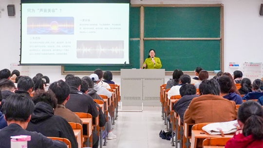 讲座以“生活中哪些声音让人感到舒适”为切入点,逐步引导师生思考声音在日常交流与艺术表达中的重要性。汤贺凤老师围绕“声音的价值”与“声音美容”的内涵展开讲解,指出声音作为“第二张脸”和“无形名片”的独特作用,激发了师生对声音训练的浓厚兴趣。她进一步阐释,朗诵不仅是一种大声诵读的语言形式,更是一门融合语言、声音与表演的综合艺术,强调通过准确的声音表达传递作品的情感与思想。