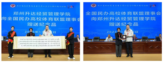 仪式现场,郑州升达经贸管理学院校长张欣与全国民办高校体育联盟理事长姜波博士互赠纪念品。这份互赠不仅承载着升达学院对联盟的诚挚谢意,更凝聚了双方深化合作、共促民办高校体育教育发展的美好愿景。