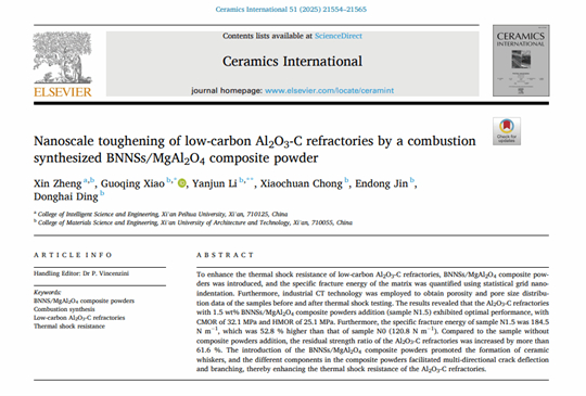 在深耕材料科学领域五年的时间中,她的成果不断获得行业认可。让郑欣倍感温暖与鼓舞的是,加入培华后,学校对科研工作给予了全力支持,为她搭建了施展专业才华的广阔舞台。今年带领团队在国际材料领域SCIE期刊《Ceramics International》发表题为《Nanoscale toughening of low-carbon Al₂O₃-C refractories by a combustion synthesized BNNSs/MgAl₂O₄ composite powder》的学术论文。这一期刊创刊于1971年,由Elsevier Ltd出版,在中国科学院分区中属材料科学大类2区,为材料科学权威Top期刊,影响因子5.6,是国际公认的材料科学权威刊物之一。