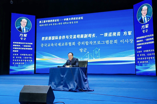 在主旨报告环节,教育部国际合作与交流司原副司长、一级巡视员、中国驻多伦多总领馆原教育参赞方军系统解读了国家教育强国战略背景下,国际合作与中外合作办学的新定位与新机遇,指出当前中外合作办学已进入“扩容、提质、增效”并重的新阶段,政策支持力度持续加大,审批流程不断优化,正迎来快速发展的战略窗口期。他鼓励中韩高校把握政策机遇,积极开展高水平、实质性的合作办学与协同创新。