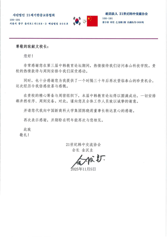 | 第三届中韩教育论坛成果丰硕,韩中交流协会会长金汉圭专函致谢泰山科技学院 |